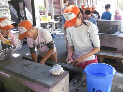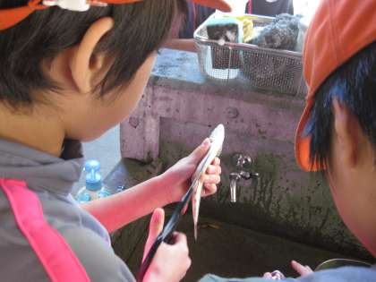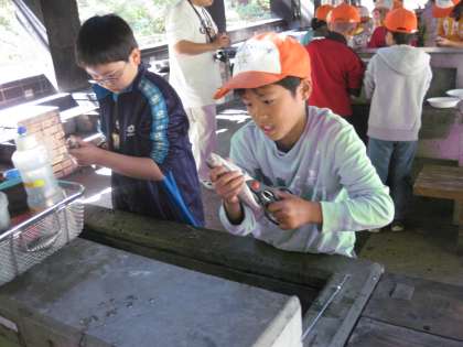 捕まえた魚を今度はさばかなくてはなりません。はじめは、気持ち悪いと言っていた子供たちも、友達の励ましや協力によって全員がさばくことができました。