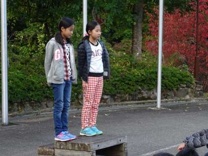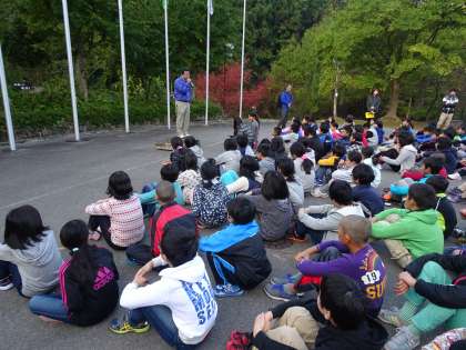 二日目は4日間ともに過ごす日野小学校と合同で朝のつどいを進めました。