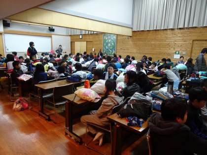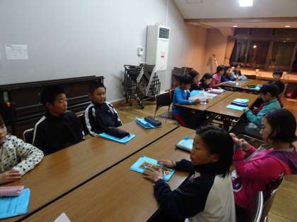 入浴後,ふり返りを行いました。たくさん歩いたおかげで,少し眠そうにしている子どもが多かったです。