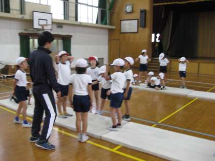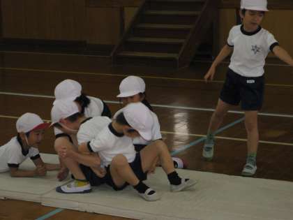 体育館で2年生がマット運動をしているのかと思ったら,すもう遊びをしているところでした。「すもう」といっても,本格的なすもうではなく,手と手を合わせて相手を動かしたり,手を握って引っ張り合ったりする運動です。