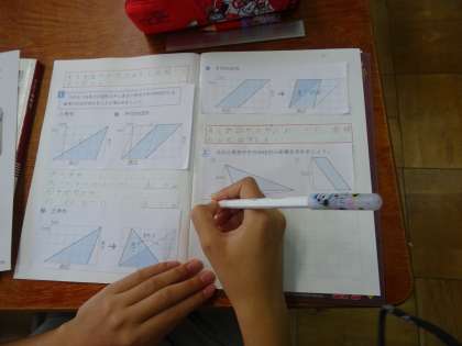 高さが外側にある三角形や平行四辺形にも公式が適用できることを理解し,公式を使って面積を求めるこを学びました。