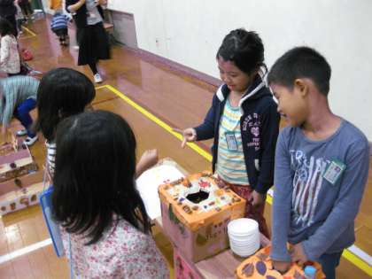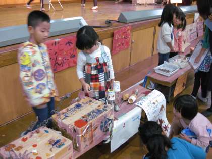 たくさん秋をつかった遊びを,最終的には板橋幼稚園の園児達を招いて一緒に遊ぶそうです。この日は,まず自分たちで実際に遊んでみて,幼稚園の子たちに楽しんでもらえるかどうかを確かめました。
