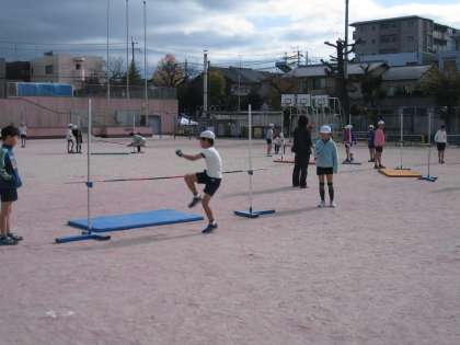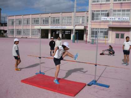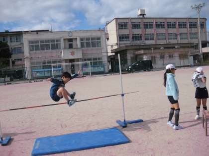 4年生が,運動場で走り高跳びに挑戦してました。はさみ跳びの練習です。歩数を合わせるのと,足をうまく抜くのがこつですね。しっかりと練習をしてください。
