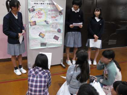 今日は,午後から伏見中学校のオープンスクールが開催されました。オープニングは,中学2年生が取り組んでいる総合的な学習の時間のパネル発表を聞きました。