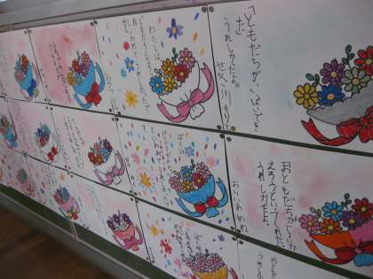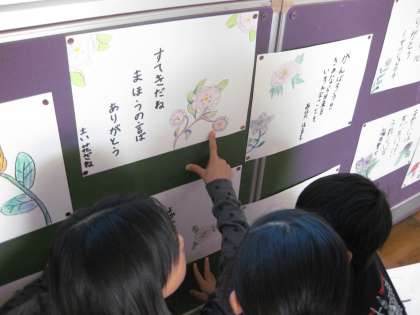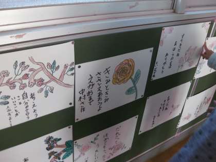 廊下の掲示板には,先日から取り組んでいた,花の絵に一言書いた作品が掲示してあります。じっくり見てみると,花の絵も当然頑張って描けていていいのですが,書いてある一言が,大変素晴らしいです。