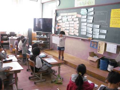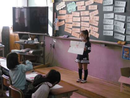 「のってみたいもの」や「いきたいところ」をみんなで話し合いイメージをふくらませて,描き出しました。描きたいもののイメージがふくらんでいたので,子どもたちの描き出しがとってもはやかったです。そして,はやく描けた子もいたので,自分の描いた絵をみんなに見せて交流をしました。