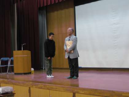 12月に入って児童会が取り組んでいた「赤い羽根共同募金」で集まった募金を,この活動の地域代表者の立原氏にお渡ししました。