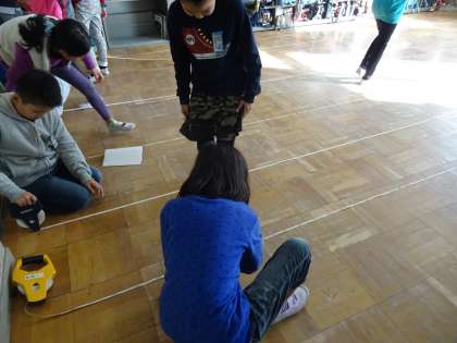 平均の考えを用いるよさに気付き,自分の歩幅を求めて距離の概則を求めました。