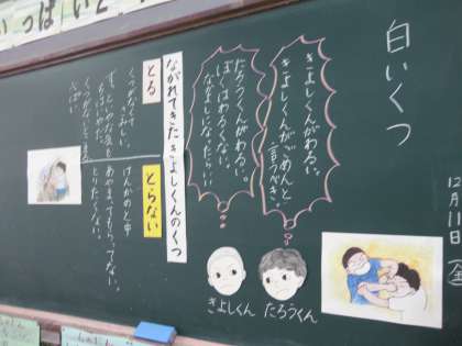 先日2年生で道徳の授業研究がありました。子どもたちが,自分のおもいや考えを持ちやすいように,適切な挿絵が用意されていたり,考えを深めるために「役割演技」の場面も用意されていました。