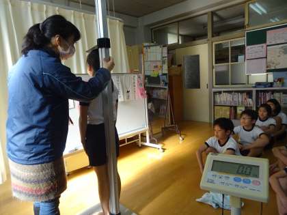 新年初めての身体計測です。中には,5cm程背が伸びた子どもがいました。自分の成長に驚いた様子でした。