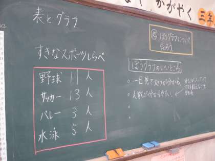 3年生の教室では,算数の時間に「表とグラフ」について学習を進めていました。表からグラフにするとどんないいことがあるのかな?