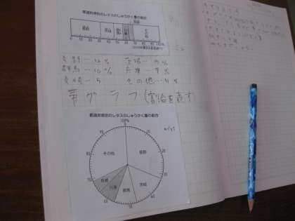 先日3年生が「表とグラフ」という単元を学習していましたが,5年生では,それが発展して「円グラフと帯グラフ」を学習していました。2種類のグラフの似ているところや違いを見つけているところでした。