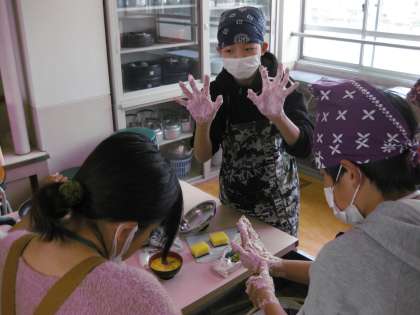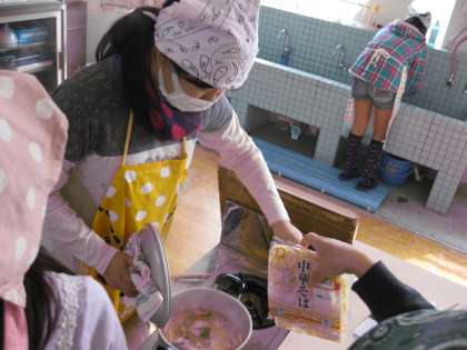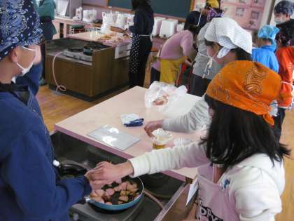 家庭科室からおいしそうなにおいがしてきました。調理実習をしているようです。家庭科室に行ってみると,6年生が調理実習の真っ最中でした。