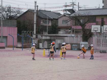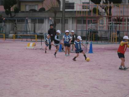2年生は,ボール蹴りゲームをしていました。パスゲームのように手でボールを扱えないので,うまくパスがまわりません。でも,意外性のあるボールが突然来たりして,結構楽しくゲームをすることができました。
