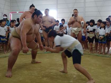 講師に伊勢ノ海部屋の甲山親方・幕内 勢関・十両 錦木関をお迎えし,子どもたちに指導をしていただきました。