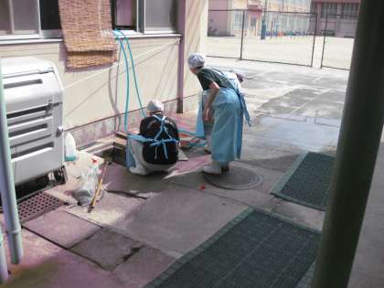 給食室から流れる排水は,できるだけ油やゴミが混じらないようにしていますが,どうしても少量が流れ出ます。それを最終的に受け取るオイルトラップが給食室の外にあります。とても,臭いがきつくて大変な作業ですが,気持ちよく給食がつくれるように,また,衛生的な環境が保てるように,給食調理員さんたちが汗をかきながら清掃をしておられました。