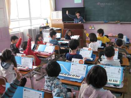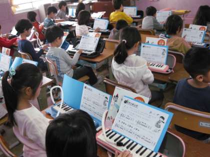 2年生の教室では音楽の授業の真っ最中でした。鍵盤ハーモニカを練習しています。1年生の時より,上手に吹けるようになってくださいね。
