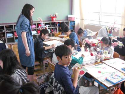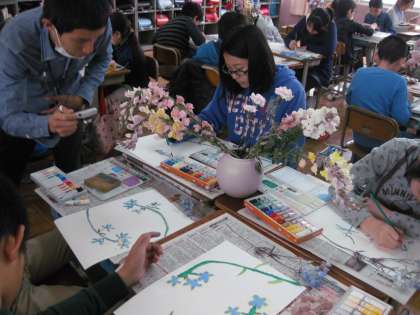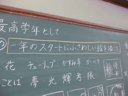 6年生のこのクラスでは,切り花の写生をしています。『1年間のスタートにふさわしい絵』が描けるかな?頑張ってください