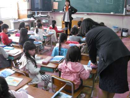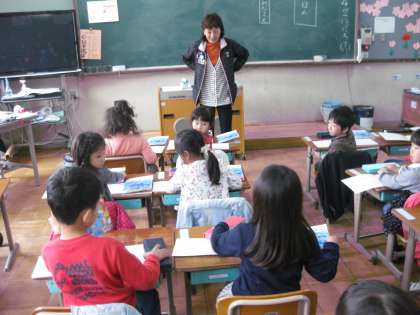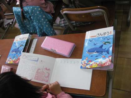 1年生の教室です。もう,算数の授業が始まりました・・・といっても,机の上にノートや本や筆箱をどのように置くのかという勉強です。とても大切なことですね。