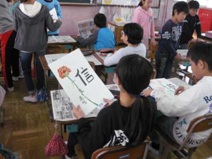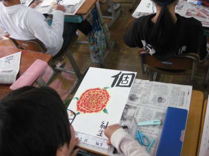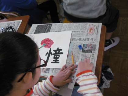 6年生の図工です。自分の好きな1つの漢字を書いて,絵をデザインしています。それぞれ漢字1字に,色々な思いが込められているのでしょうね。