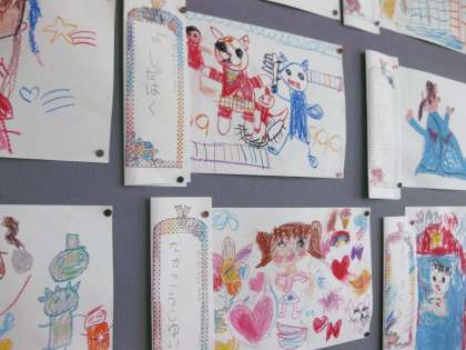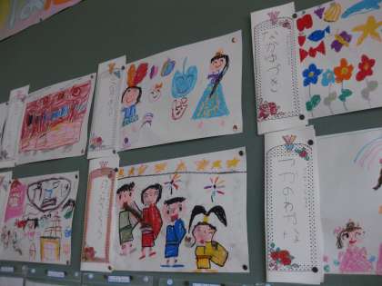 1年生の教室の後ろを見てみると,初めて学校で描いた絵でしょうか,とても楽しく描けています。じっと見ていると,絵に描かれている子どもたちがしゃべるかけてくるようです。
