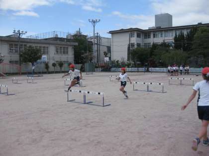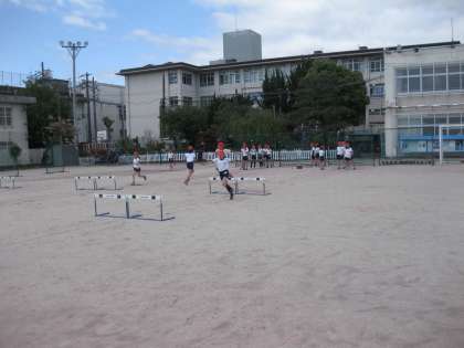 2年生の隣では,5年生がハードル走に取り組んでいました。5年生の時もしているので,上手に跳びこしていく子が多いです。インターバルをあわせて,より速く走りきれるようにしてください。