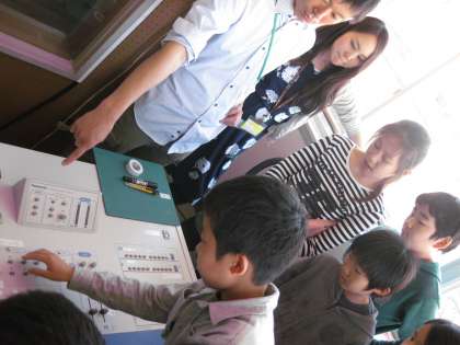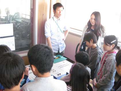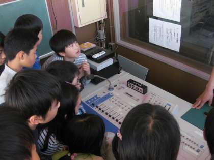 画像は,放送委員会です。昨年も放送委員会をしていた子が,放送機器の使い方を他のメンバーに教えています。