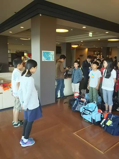 本日お世話になる下電ホテルに着きました。入館式で,「よろしくお願いします!」と代表の子どもたちを中心にホテルの方々にあいさつをしました。