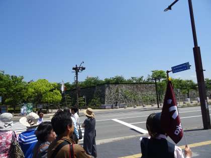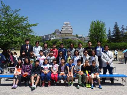 姫路城に到着しました。学級写真撮影後,歴史ガイドさんと城内を回ります。