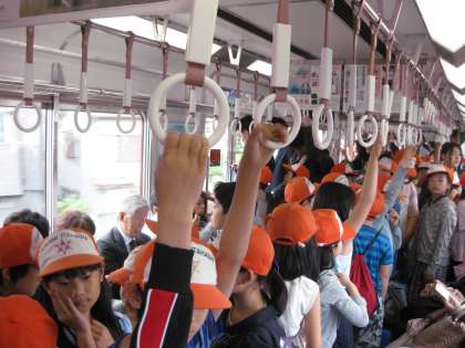丹波橋駅から近鉄電車に乗って竹田駅で京都市営地下鉄に乗り換え丸太町駅まで行きます。伏見板橋小学校の子どもたちは電車の乗り方に慣れているのか,ワイワイ騒がず,マナー良く乗車できました。