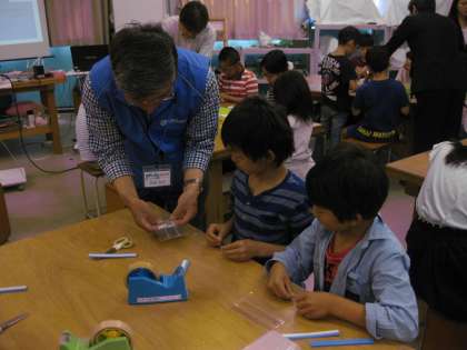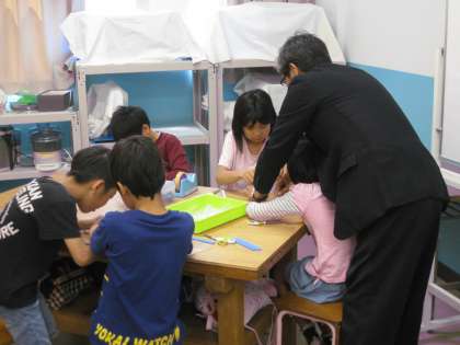 今日のモノづくりを提供していただいた,企業のOBの方がたにもお手伝いをいただきながら,出来上がりました。さて,何が出来上がったのでしょう。