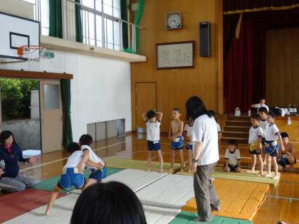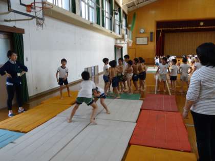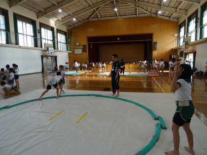 1〜6年生の全学年の児童が楽しく活動できるのが相撲部のよさです。高学年児童が低学年を優しくリードしながら活動しました。