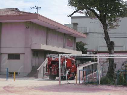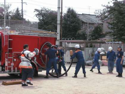 一通り避難訓練の様子のことをお聞きしたり,火事に関する問題を出してもらったりして,さあ,いよいよ放水訓練の様子を見せてもらおうとしたとき・・・