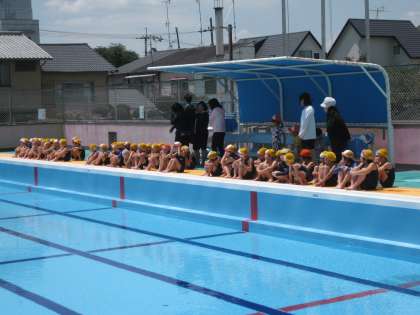 腰洗いをすませ,シャワーも浴びて「さあー水の中に!」と思いましたが,プールでの大切な約束を聞いたり,準備体操の仕方を聞いたりで,なかなか水の中には入れません。