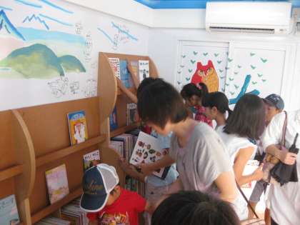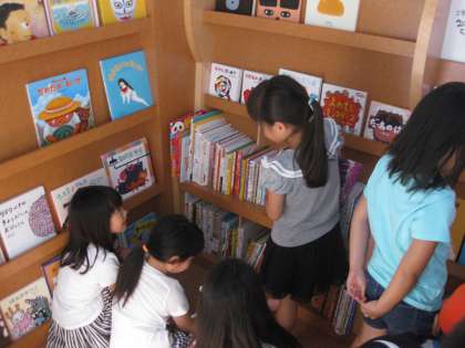 大きな車の横のドアが開くと,本がいっぱい出てきました。この車は,動く図書館みたいですね。