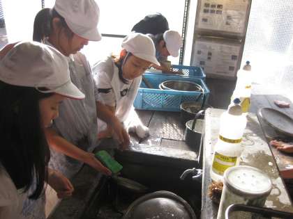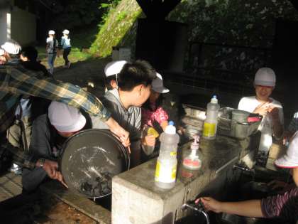 おいしくいただいた後は、後片付けです。マキで鍋の中の具材を炊いたので、ススがこびりついています。なかなか落ちません。また、ご飯を炊いた鍋もぬめりが洗い落とせません。でも、班のメンバーで協力して何とか後片付けができました。