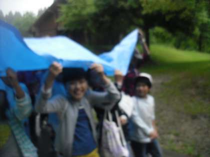 野外炊事していると、大雨になりました。やり始めたときは、晴れていたので傘を持たずに炊飯場に来ました。ロッジまで、たった100m〜200mくらいの距離ですが、なかなか移動できませんでした。すると、所員さんがブルーシートを貸してくださいました。こんな経験もなかなかできませんね。