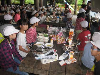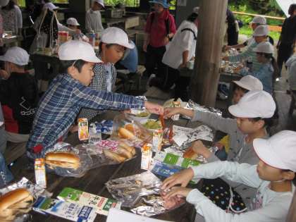 3日目の朝食は、パックドックです。牛乳パックに、アルミホイルで包んだウィンナー入りのパンを入れで焼きます。まず、準備です。