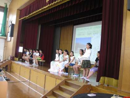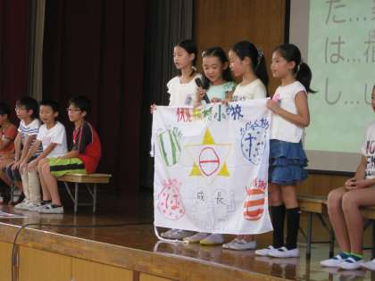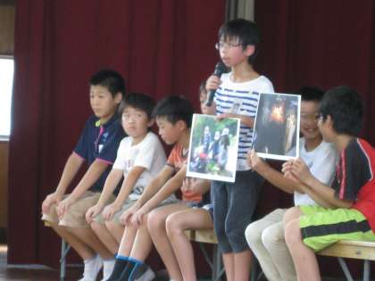 5年生が,山の家での出来事を簡単に紹介しました。単に,楽しかった思い出を伝えるのではなく,今日のメインは,自分たちが考えた目標をどの様にして頑張ったかを発表してくれました。