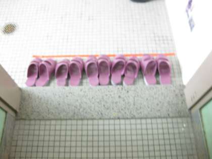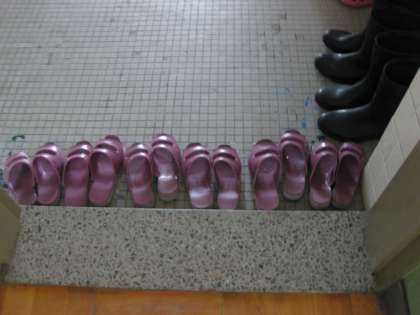 『トイレのスリッパをそれえる』 簡単なことですがなかなかできません。これは,本校だけではなく,多くの学校で悩んでおられる,簡単でなかなか定着できない課題です。スリッパを脱ぐところに木の枠が置いてあったり,ペンキで靴形が描いてあったり,それぞれの学校で工夫した取組をしています。