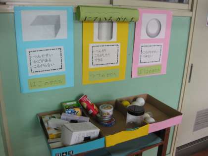 1年生の廊下に算数コーナーがあります。今は,立体が置いてあります。休み時間に子どもたちは実際に手にとって確かめることができます。具体物がいつもさわれるのはいいことですね。