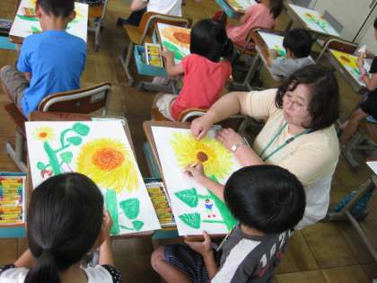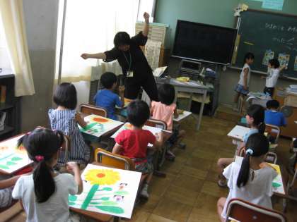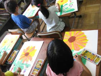 図工に時間です。思い切って大きな大きなひまわりを描きました。そのひまわりに自分が,葉っぱでブランコしたり,花びらにつかまったりと,とても楽しそうな絵が描けました。