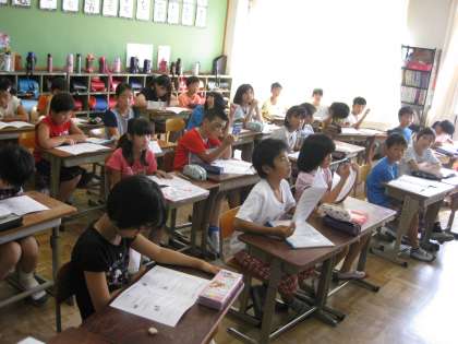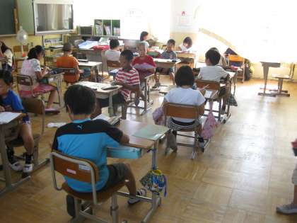 4年生は,夏休み前のまとめのテストをしているクラスや,学校から出される「夏休みのくらし」のプリントをみんなで読み合って,確認しているクラス,そして,みんなが楽しみにしている?????宿題のプリントを綴じているクラスがありました。