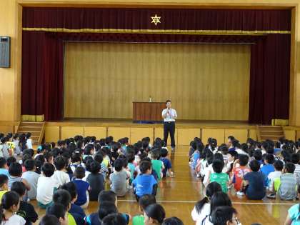 前期後半の開始です。体育館で校長先生のお話を聞き,前期後半の見通しをもちました。