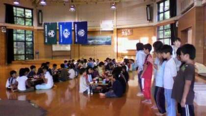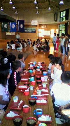 急な夕立がきたので、プレイホールで夕食をとることにしました。