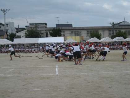 5年生の最後の競技は,縄引きです。始めのうちは,あっという間に縄を自陣に引っ張り込むことができるのですが,残り少なくなると集団戦になって迫力満点でした。