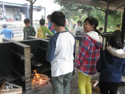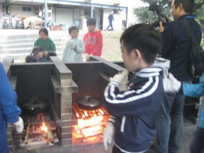 いよいよかまどに火をつけて、食材を煮込みます。今日のメニューはすき焼風煮です。美味しくできるでしょうか?