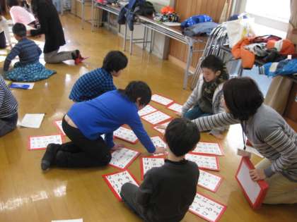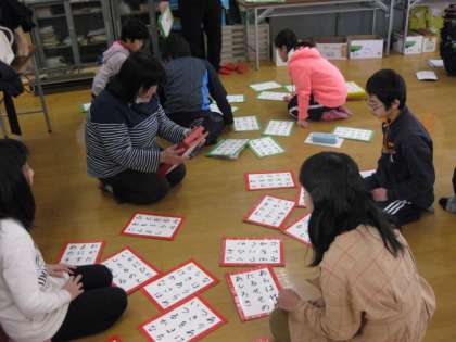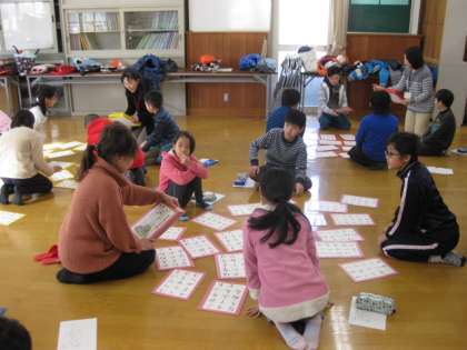 今日は,とても寒い日となりました。しかし,子どもたちはとても元気に学校に登校してきました。前半は低学年が,後半は高学年がふれあいサロンで大型カルタとりしました。上の句聞いただけで手が伸びる強者(つわもの)もいました。