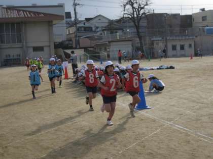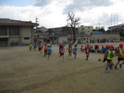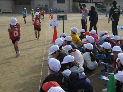昨年は,北堀公園まで往復1時間かけて行って,実際に走った時間は4〜7分ぐらいでしたが,今年は,全員が10分間を自分のペースで走りきりました。応援の保護者の方々の声援にも後押しをされて,普段よりよい走りができたようです。