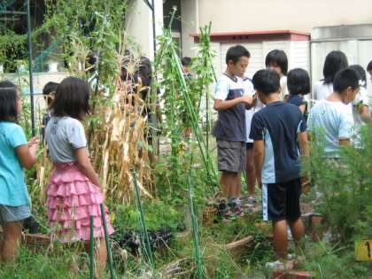 写真は、朝顔の受粉の働きを調べる実験中の子ども達です。